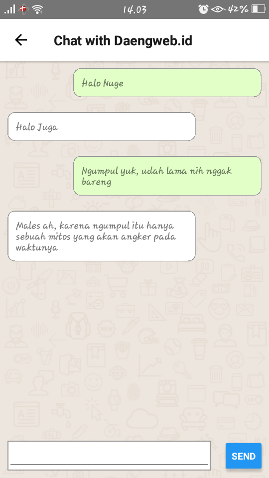 Sampai pada tahap ini, aplikasi chatting whatsapp clone telah berhasil dibuat dan dapat berjalan sebagaimana mestinya. Saat aplikasi di-load maka akan tampak seperti ini :