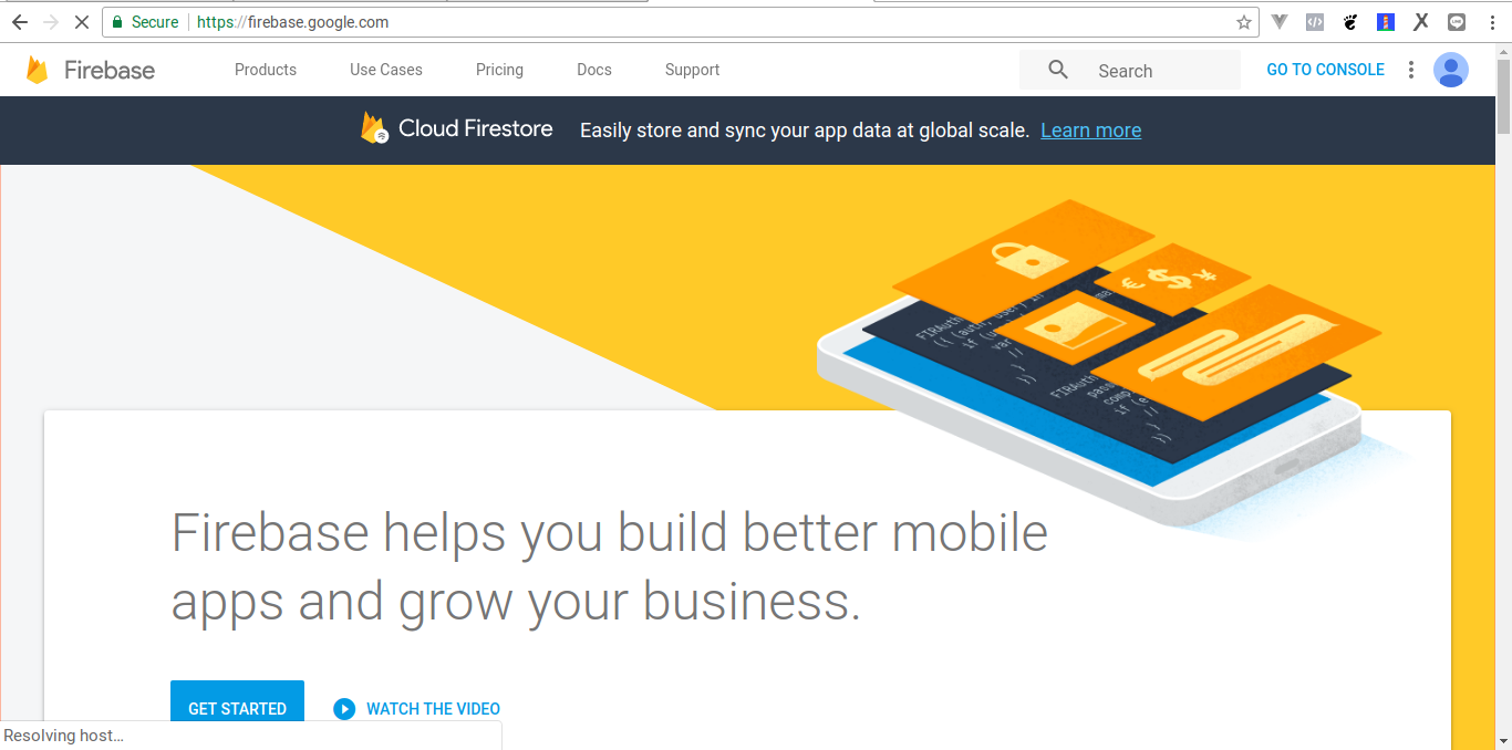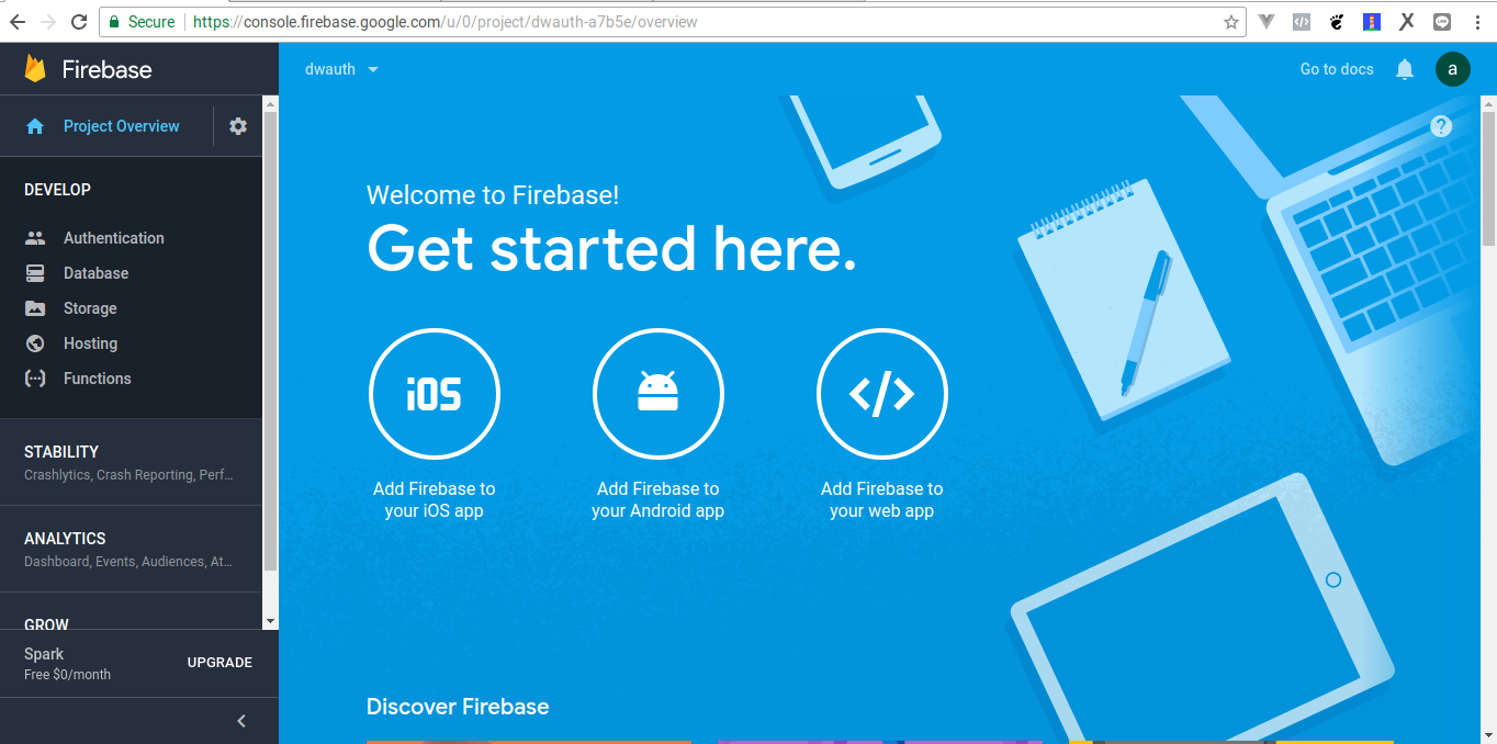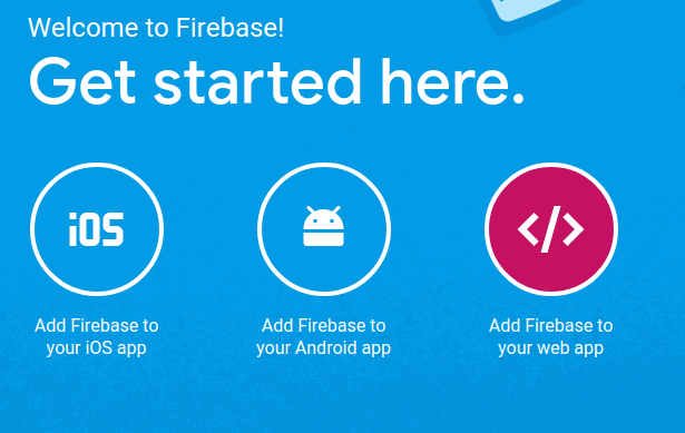 Setelah itu kamu dapat meng-klik GET STARTED atau GO TO CONSOLE, dan kamu akan diarahkan ke dalam Firebase console, dimana kamu dapat membuat konfigurasi Firebase.